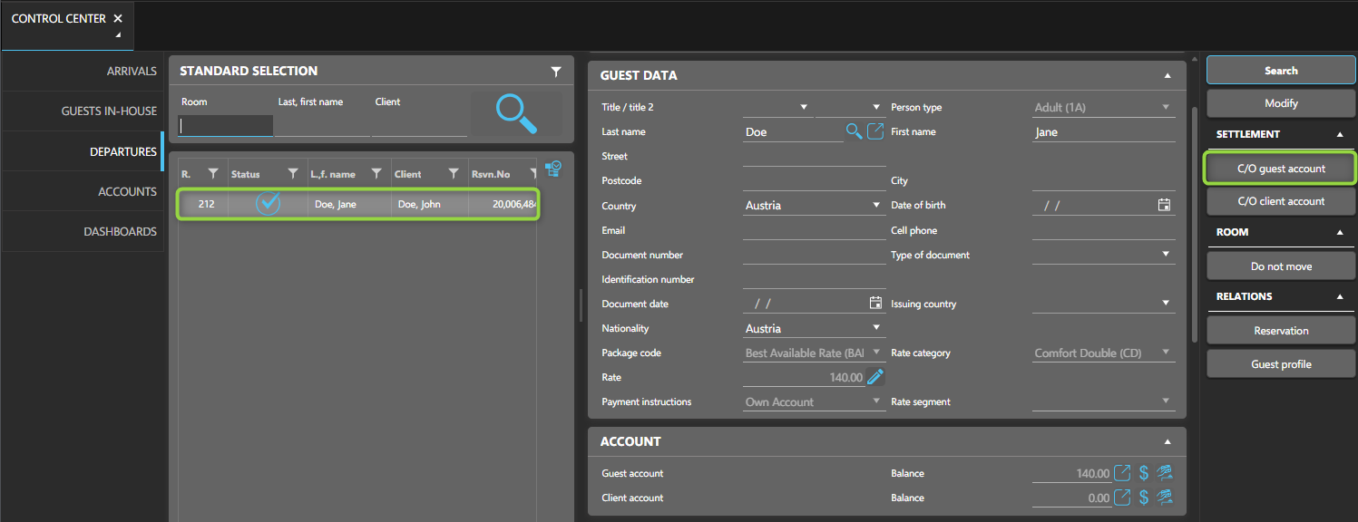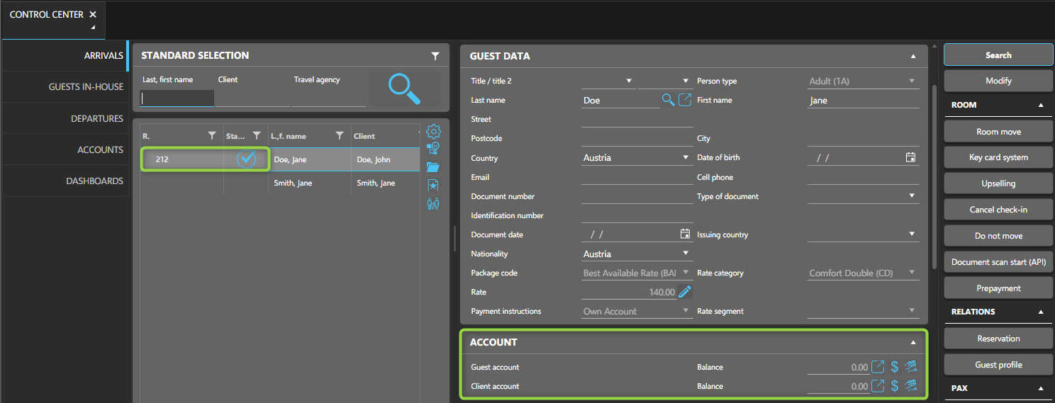 The Control Center gives you an overview of the current day arrivals, departures, in-house guests and accounts.