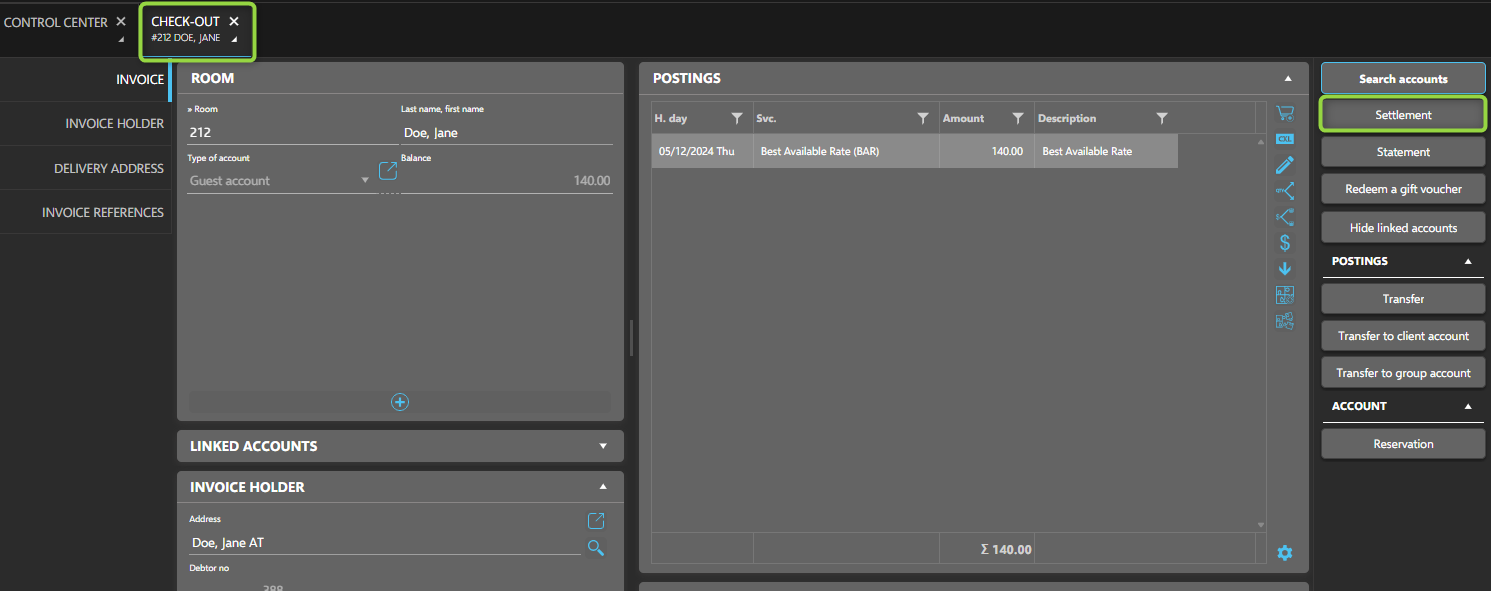 You can process a checkout for guests through various layouts, such as Room rack, Reservation, Rooming list, or Control Center. Just like check-in, checkout can be done individually.