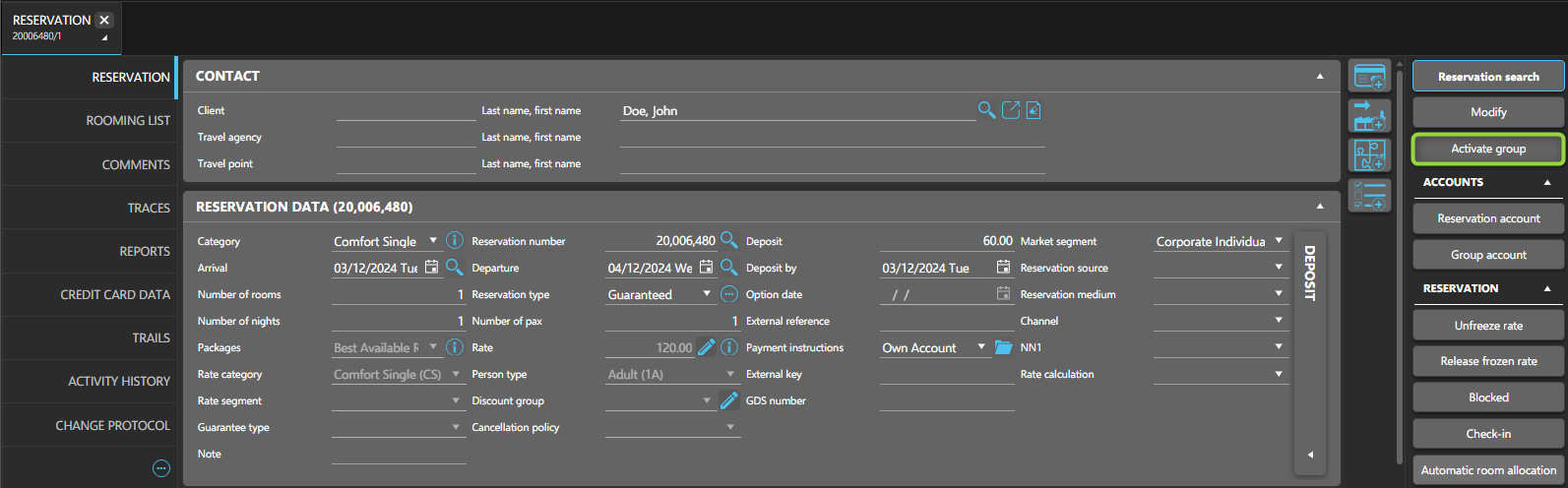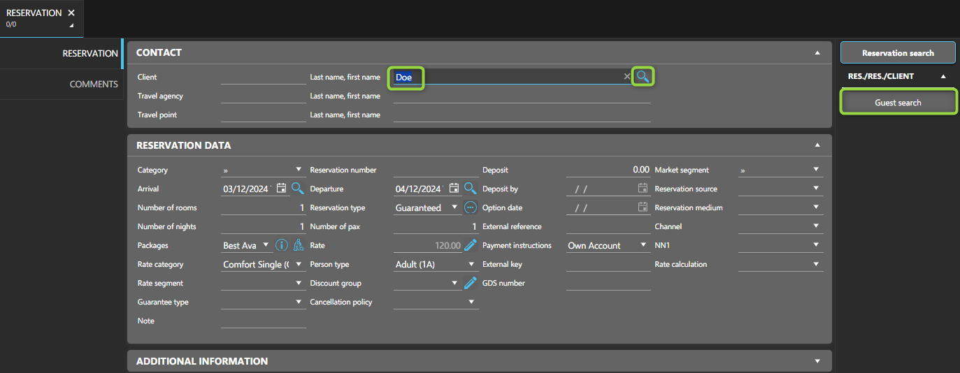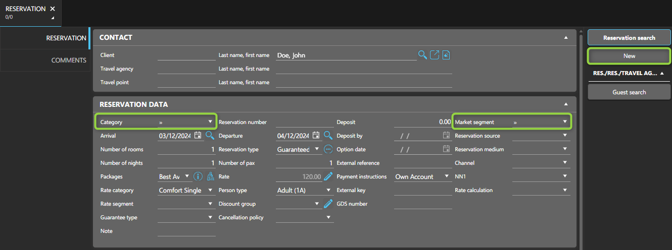 - Enter key details (e.g., stay dates, room category) in the main reservation data.