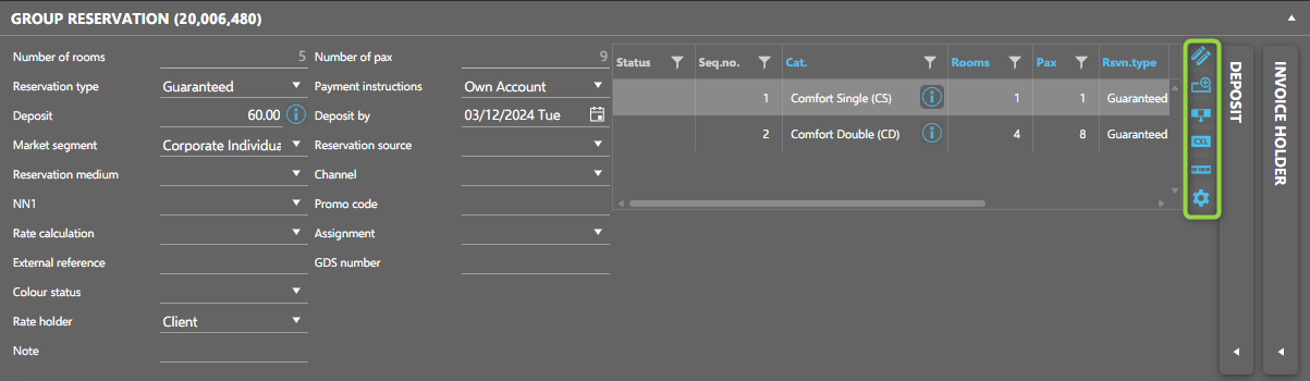 - Group Reservation section: common data for all elements.