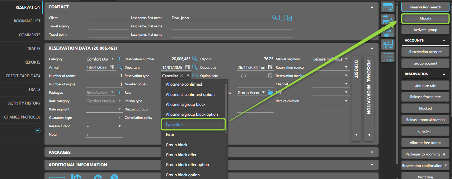 - Choose the new status (e.g., Cancelled, No-show).