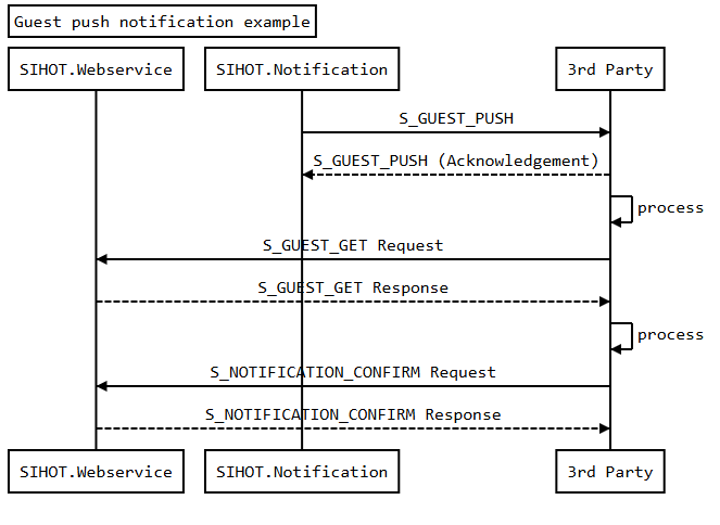 Notifications in SIHOT@360º Open API follow an asynchronous approach. Once a notification is delivered to the endpoint, an acknowledgment response is expected based on the notification service. This means e.g. a S_GUEST_PUSH notifications expects a S_GUEST_PUSHResponse as an immediate response.