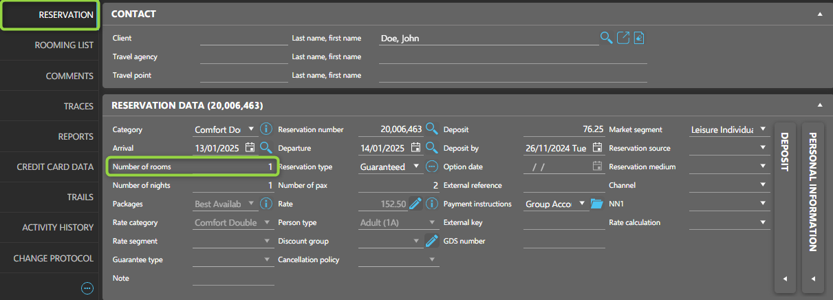 The data within the RESERVATION element reflects the information shown on the main reservation page in SIHOT, offering general details about the overall reservation. However, this data can be overwritten for specific rooms or individual entries within the reservation.